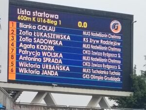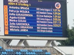 Bardzo dobrze spisały także się nasze zawodniczki Zosia Łukaszewska i Marta Łukomska w U 14. Zosia pobiła swój rekord życiowy na 600m -1.59.56. Marta również pobiła życiówkę na 300 m -54.82 Dla dziewcząt był to debiut w zawodach tej rangi. Pojechały po naukę zdobywając cenne doświadczenie pod okiem trenera Waldemara Zasady